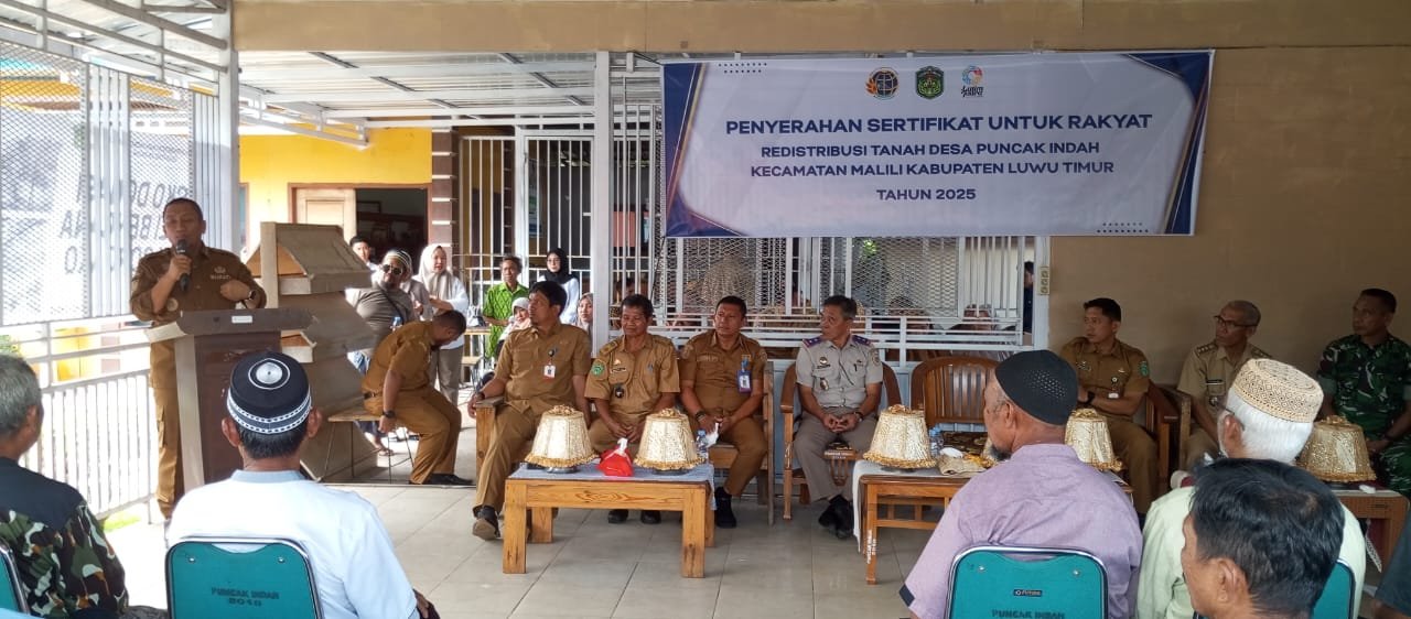 Penyerahan sertifikat dilakukan langsung oleh Bupati Luwu Timur, Ir H Irwan Bachri Syam, ST, IPM, dalam acara yang digelar di Kantor Desa Puncak Indah, Malili, Senin (22/9/2025).