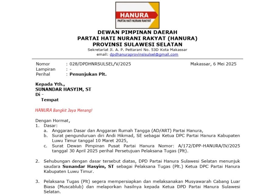 Sebagai tindak lanjut, Dewan Pimpinan Daerah (DPD) Partai Hanura Provinsi Sulawesi Selatan mengeluarkan surat keputusan dengan nomor 028/DPDHNRSULSEL/V/2025 tertanggal 6 Mei 2025, yang menunjuk Sunandar Hasyim ST, sebagai Pelaksana Tugas (Plt) Ketua DPC Hanura Kabupaten Luwu Timur.