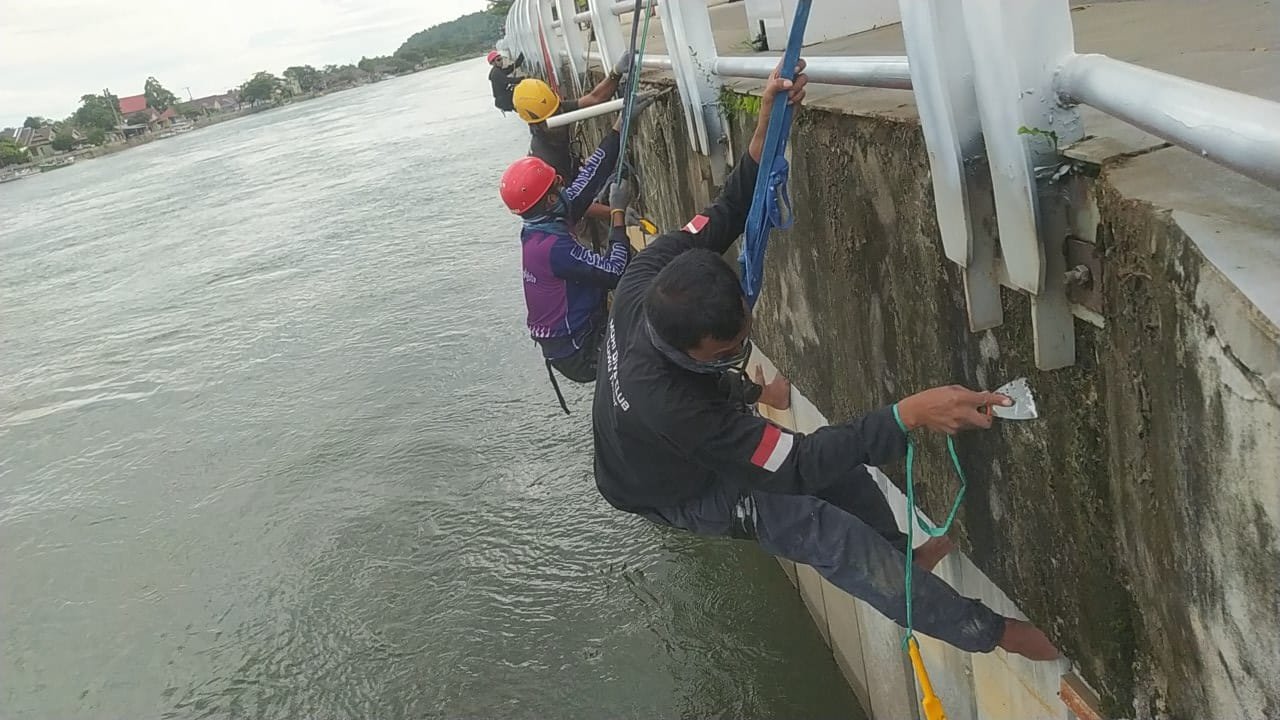 Dengan semangat gotong royong, para relawan terlihat bergelantungan di tepi anjungan, mengikis lumut dan kotoran yang menempel di dinding beton.