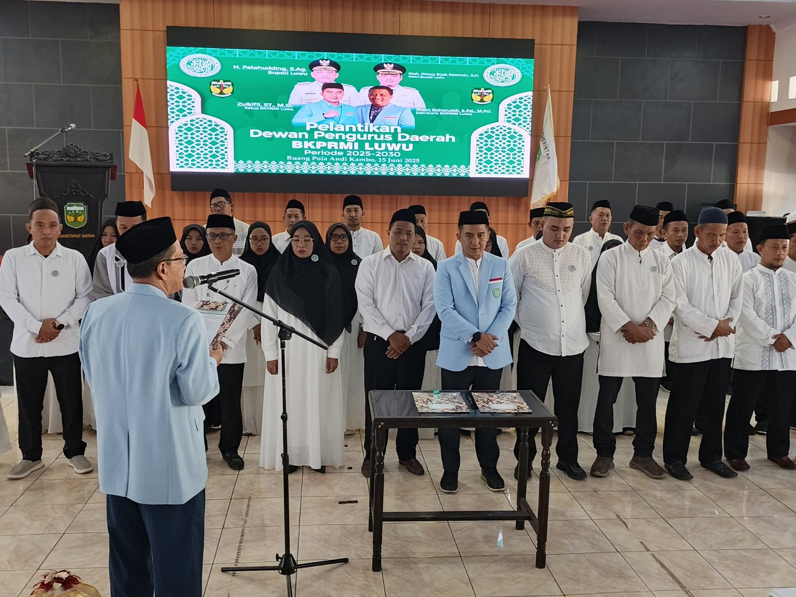 LUWU, TEKAPE.co – Plh. Ketua Umum Dewan Pimpinan Wilayah (DPW) Badan Komunikasi Pemuda Remaja Masjid Indonesia (BKPRMI) Sulawesi Selatan, DR. Amruddin, melantik jajaran pengurus baru Dewan Pimpinan Daerah (DPD) BKPRMI Kabupaten Luwu periode 2025–2030. Pelantikan berlangsung di Ruang Pola Andi Kambo, Kompleks Perkantoran Bupati Luwu, Ahad, 15 Juni 2025.