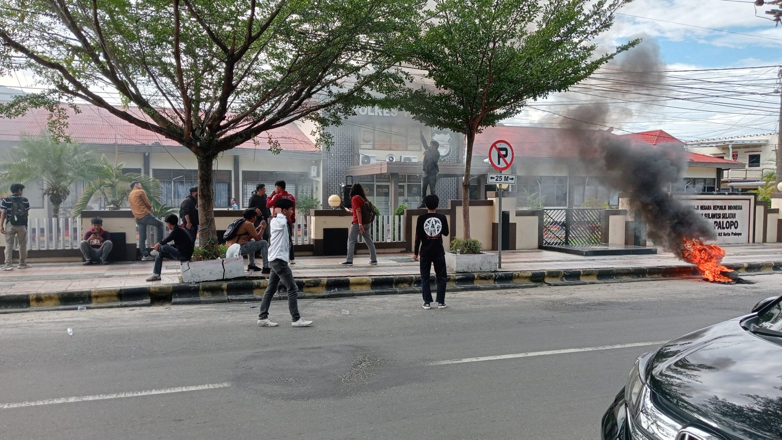Dalam aksinya, mahasiswa membakar ban bekas dan berorasi di depan Mapolres.