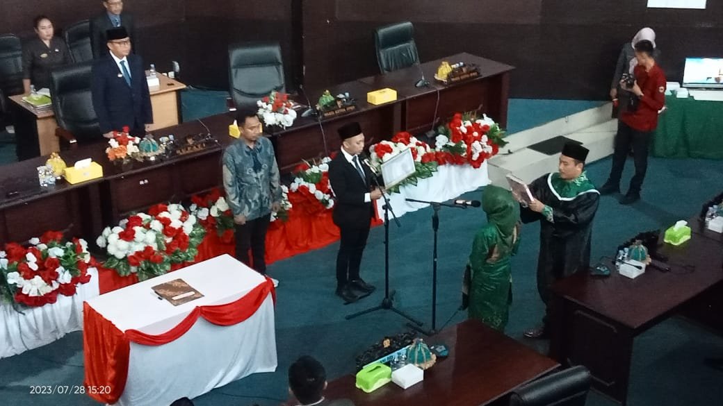 MORUT, TEKAPE.co – Dewan Perwakilan Rakyat Daerah (DPRD) Kabupaten Morowali Utara (Morut), menggelar Rapat Paripurna dalam rangka pengambilan sumpah Anggota DPRD Morut Pengganti Antar Waktu (PAW), Rindayani Dewi Sucitra, dari Partai Bulan Bintang (PBB), di ruang sidang utama DPRD Morut, Jumat 28 Juli 2023.