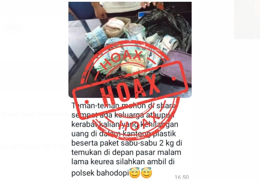 “Teman-teman mohon di-share, siapa tahu ada keluarga atau kenalan yang kehilangan uang dalam kantong plastik dan paket sabu-sabu 2 kg. Katanya ditemukan di depan pasar malam lama Keurea. Silakan ambil di Polsek Bahodopi,” demikian kutipan unggahan yang viral itu.