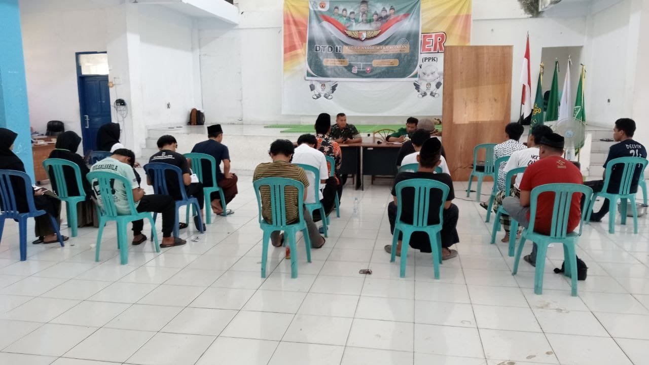 PALOPO, TEKAPE.co – Kasdim 1403 Palopo Mayor Arm Syafaruddin memberikan materi wawasan kebangsaan kepada peserta Diklat Terpadu Dasar (DTD) II Pimpinan Anak Cabang Gerakan Pemuda Ansor.