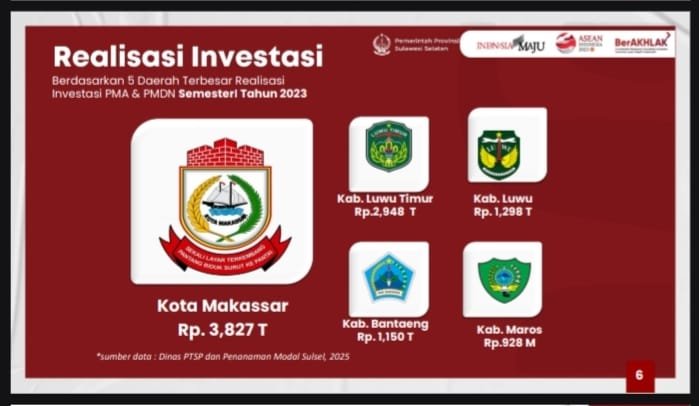 MAKASSAR, TEKAPE.co — Kabupaten Luwu Timur mencatat prestasi membanggakan dengan menempati urutan kedua sebagai daerah dengan realisasi investasi terbesar di Sulawesi Selatan pada Semester I Tahun 2023.