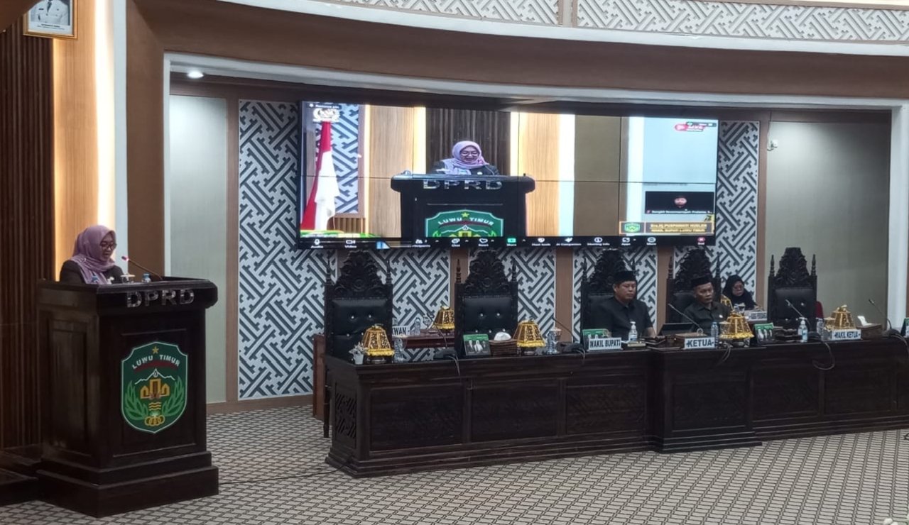 Wakil Bupati Luwu Timur, Hj Puspawati Husler, mewakili Bupati Irwan Bachri Syam, membacakan sambutan dan tanggapan pemerintah daerah yang menyasar satu per satu pokok pandangan dari lima fraksi DPRD.