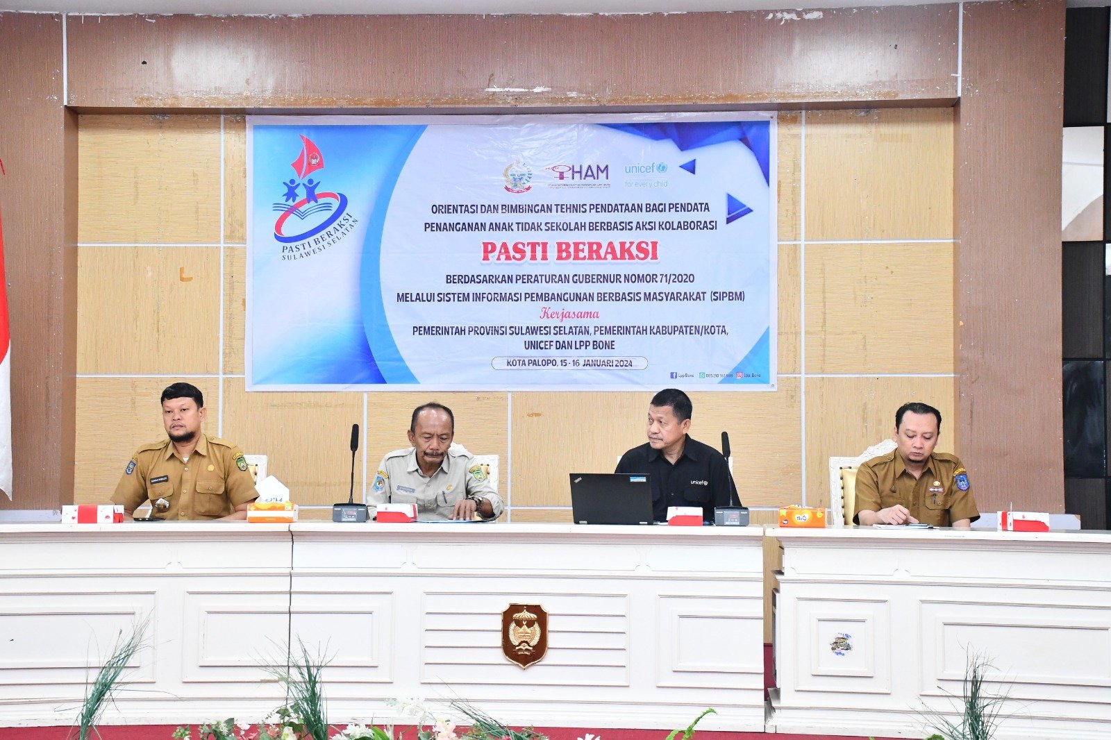 PALOPO, TEKAPE.co – Pemerintah Kota (Pemkot) Palopo bekerjasama dengan UNICEF wilayah Sulawesi-Maluku, menggelar Orientasi dan Bimtek Pendataan Penanganan Anak Tidak Sekolah Berbasis Aksi Kolaborasi (Pasti Beraksi).
