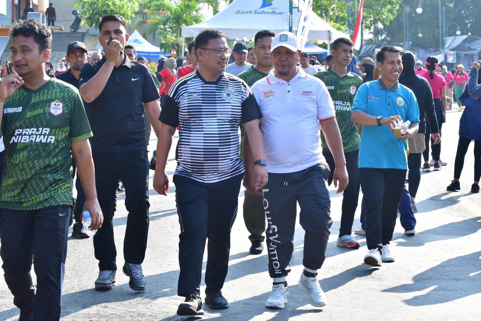 Pj Wali Kota berbaur dengan masyarakat olahraga bersama seusai jalan santi mengitari sejumlah jalan.