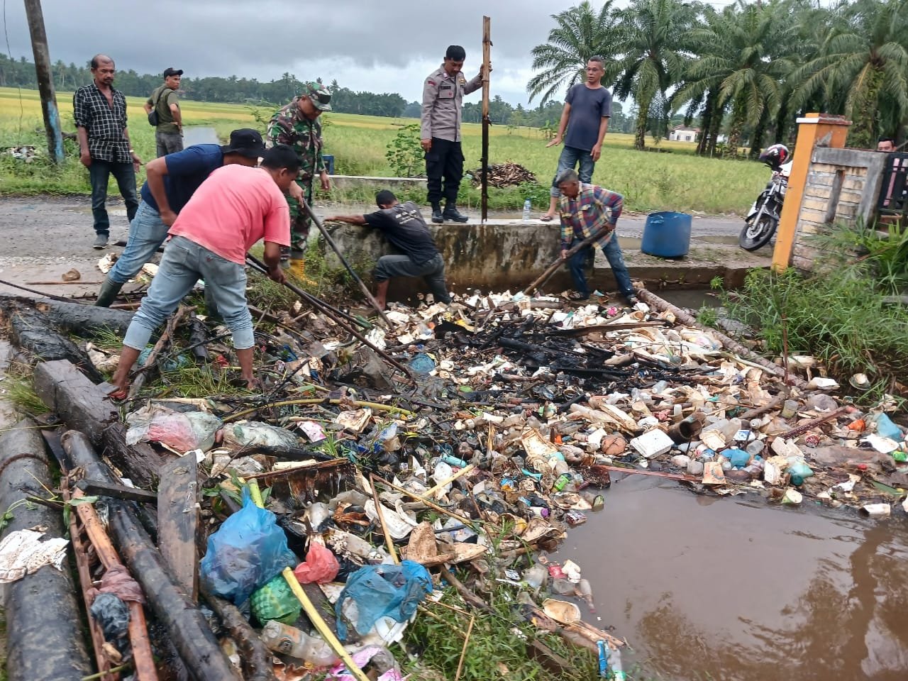 Pembersihan ini dilakukan di lokasi titik kumpul sampah yang berada di sepanjang drainase irigasi desa tersebut.