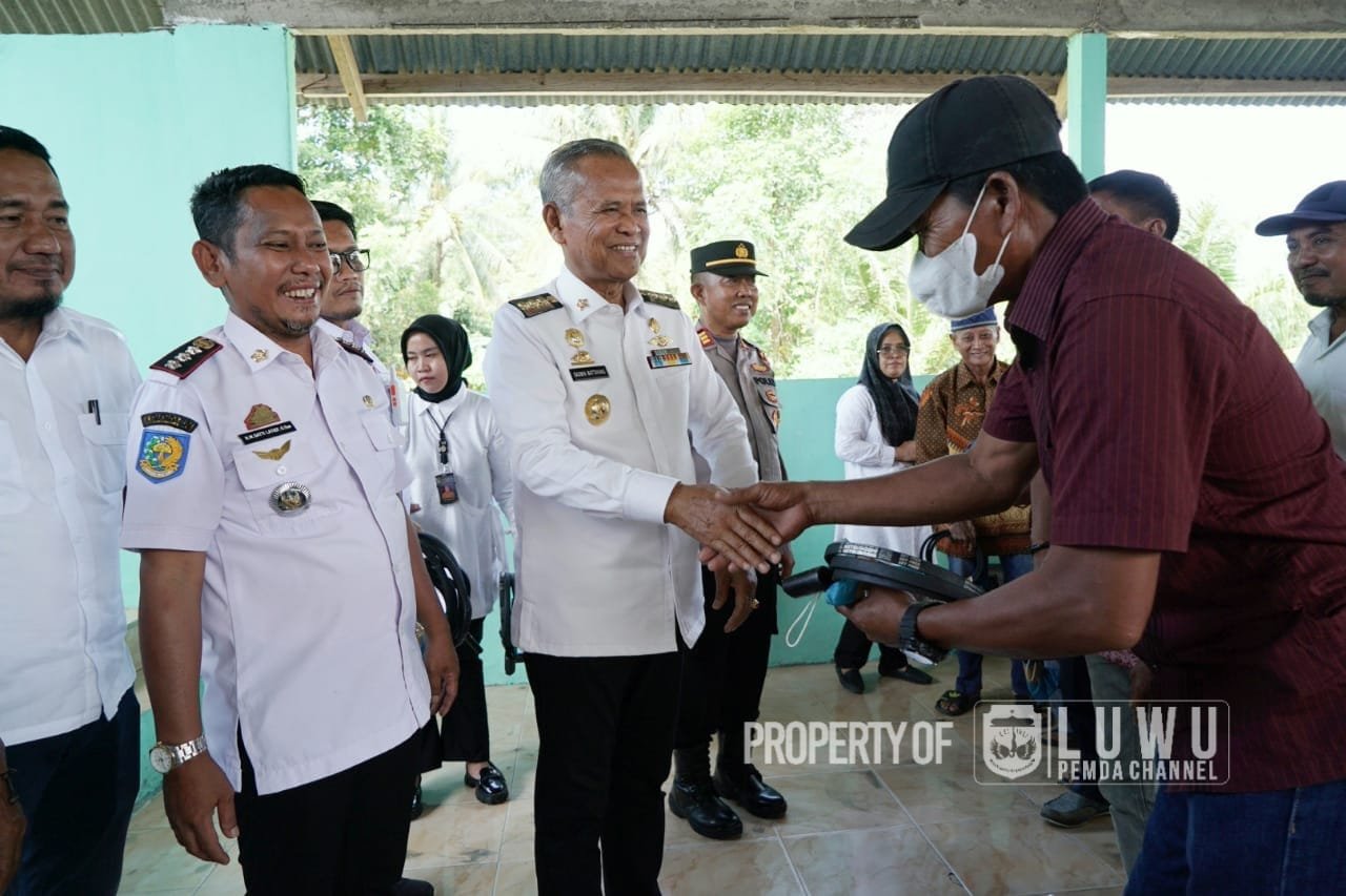 Foto: Bupati Luwu, Dr H Basmin Mattayang, M.Pd, didampingi Camat Bua, H. Satti Latif Jabbar, Saat Menyalami Petani Usai Menyerahkan Bantuan Hand traktor, di Desa Raja, Kecamatan Bua, Kabupaten Luwu. (dok.diskominfoluwu)