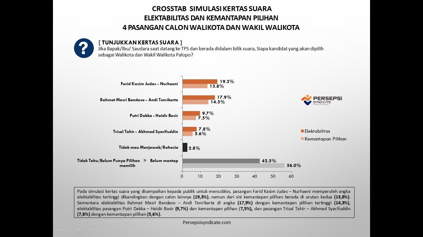 Sementara itu, pada simulasi head to head, menemukan elektabilitas paling tinggi diraih pasangan Rahmat Masri Bandaso – Andi Tenrikarta (29,5%), dibandingkan pasangan Farid Kasim Judas – Nurhaeni yang hanya (21,7%), sementara rahasia (3,3%) dan undecided voters (45,5%).