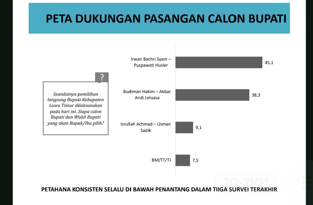 Setelah dilakukan tiga kali survei, LSI menyimpulkan pasangan calon nomor urut 3, Irwan Bachri Syam – Puspawati Husler (Ibas – Puspa), akan memenangkan Pilkada Luwu Timur.