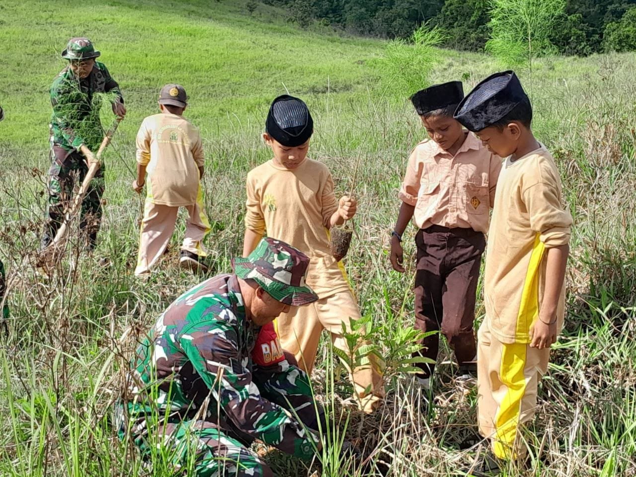 TNI AD Kodim 1403 Palopo bersama siswa Madrasa di Towuti, Kabupaten Luwu Timur, menanam bibit pohon, Minggu 31 Desember 2023. (Dok: Kodim Palopo)