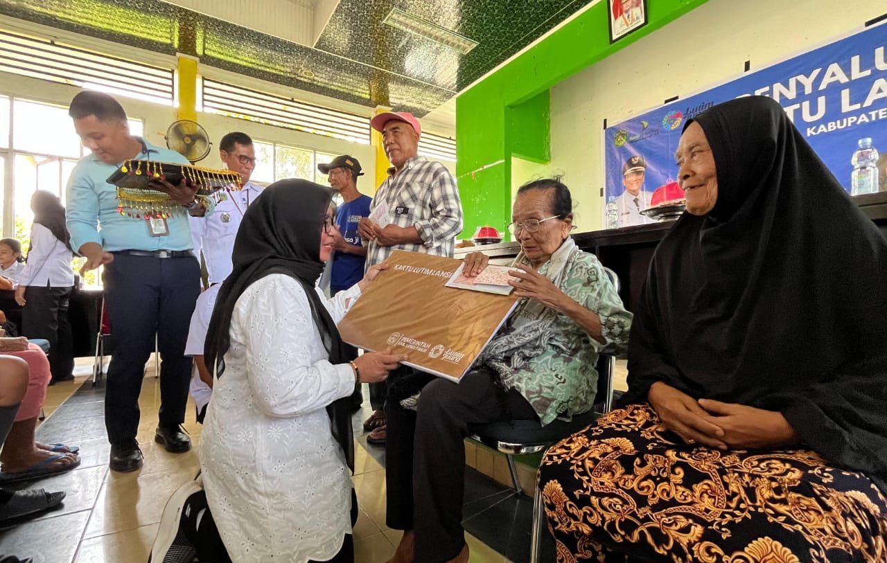 Wakil Bupati Luwu Timur, Hj Puspawati Husler, menyalurkan bantuan Kartu Lansia di dua kecamatan, yakni Tomoni Timur dan Tomoni, Rabu, 5 November 2025.